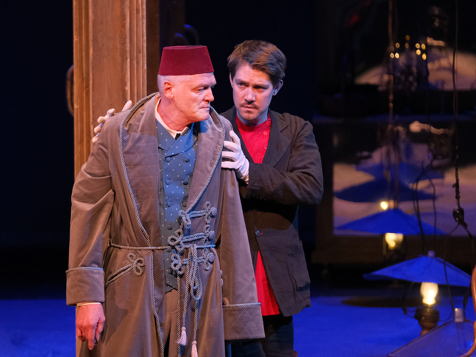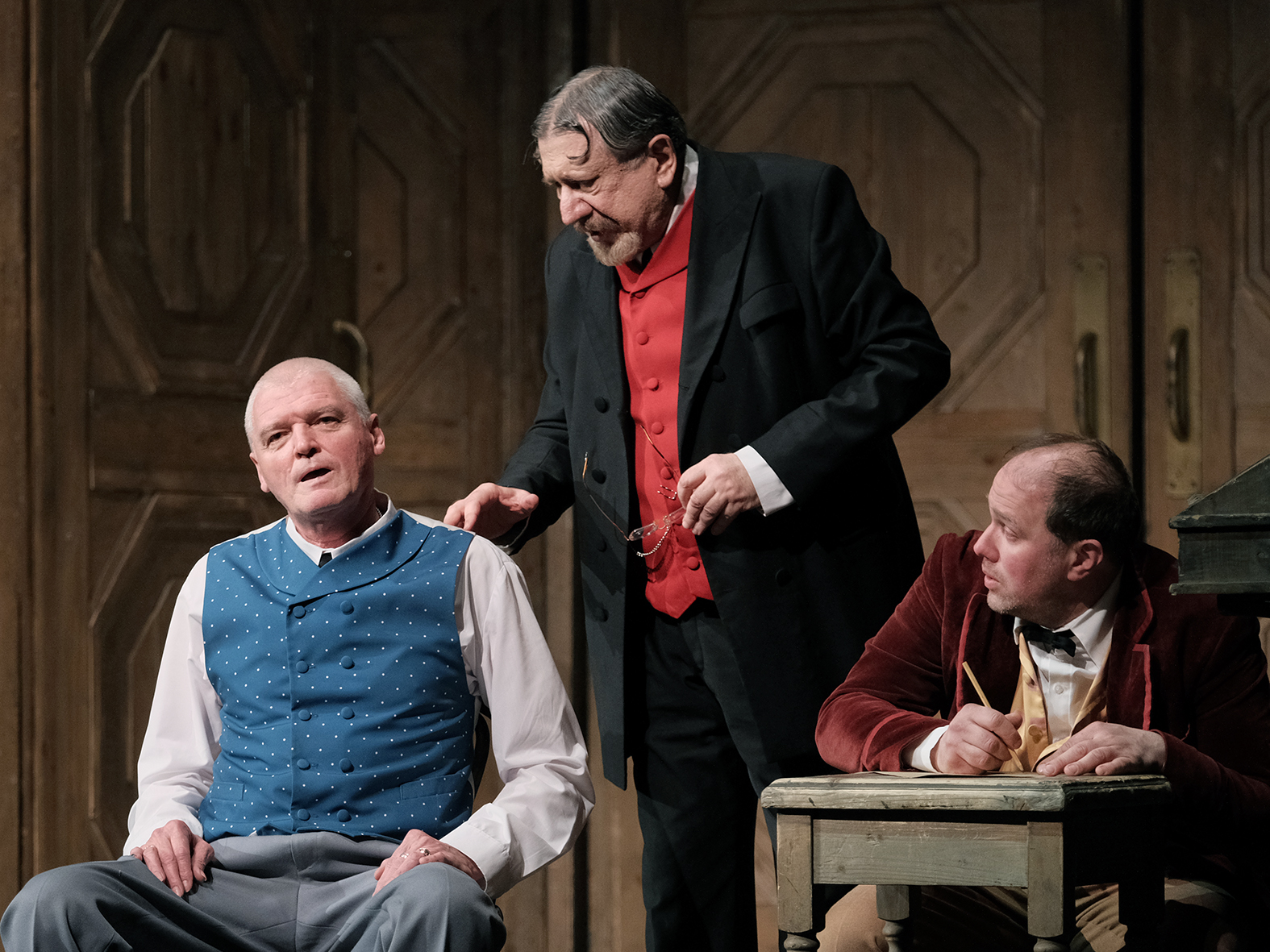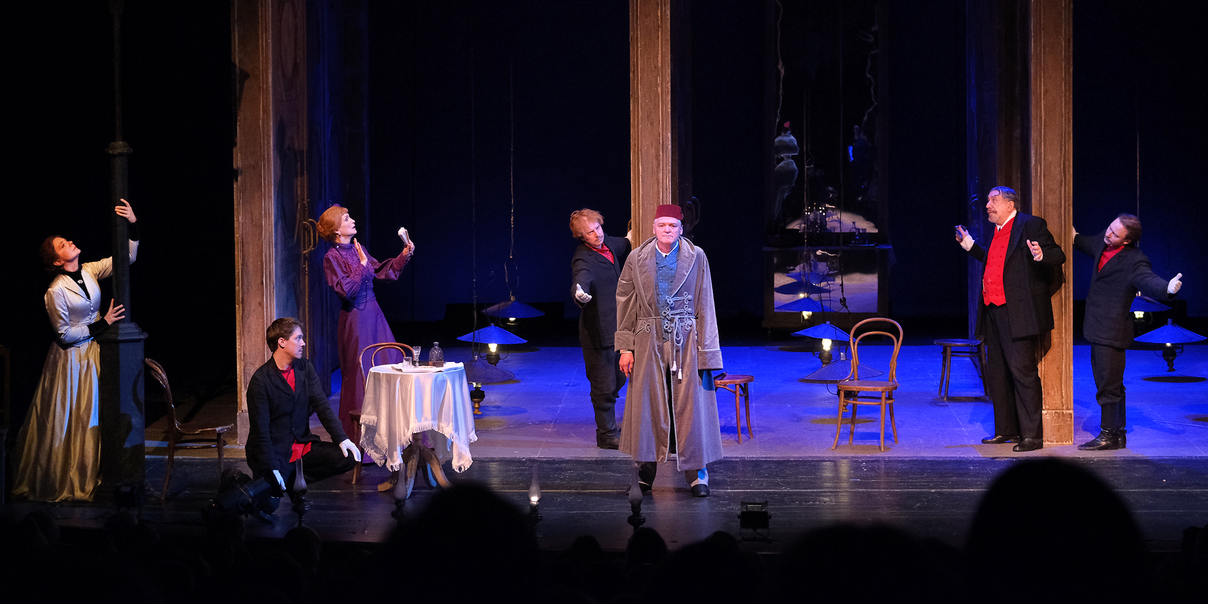 Смотрела очень критически, невольно сравнивая с Малым, боялась расстроится какой-нибудь вольностью режиссера или актерской фальшью, но опасения были напрасны: все было супер. Ошеломляющие декорации упирались в небеса. Атласные платья, элегантные шляпки, кафтаны и бекешы – все из русской жизни, все из царской России. Чего только стоят бабьи балясы или мужицкие мысли, острые как бритва, в каждой фразе которых афоризм или русская пословица.